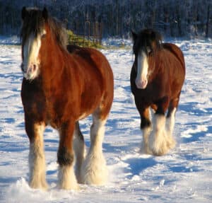 The Clydesdale is said to have an elegant way of moving and, while nobody would say that it’s a high stepper, it certainly does have a higher knee action than most other heavy horses. This can that they don’t drag their silky feathers along the ground.