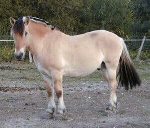 Color: The Norwegian Fjord can be any one of six different colors. 90% of them are brown dun (also known as bay dun), while the rest are either red dun, gray, white dun (or buckskin dun), yellow dun, or white (known in other breeds as cremello). Regardless of their color, all horses have dark points (ears, mane, tail, and legs) with primitive markings such as a dorsal stripe.